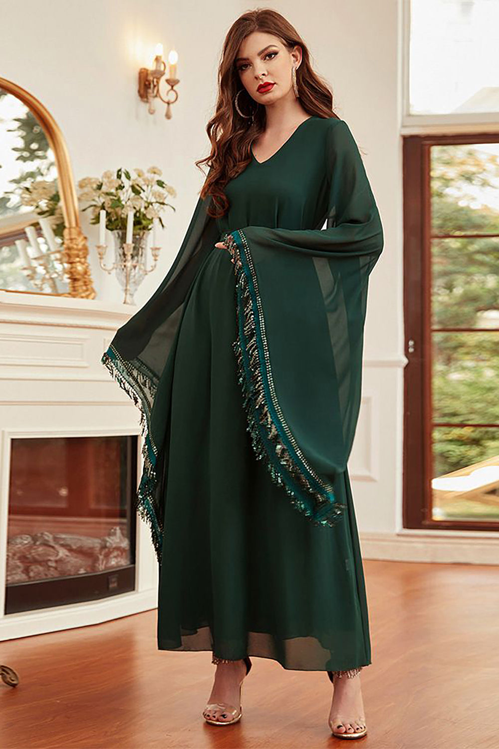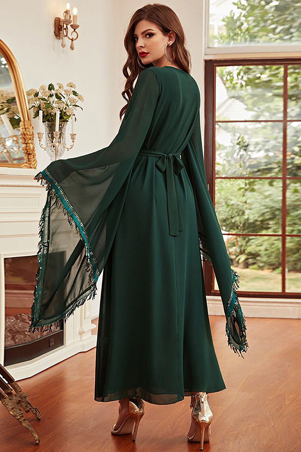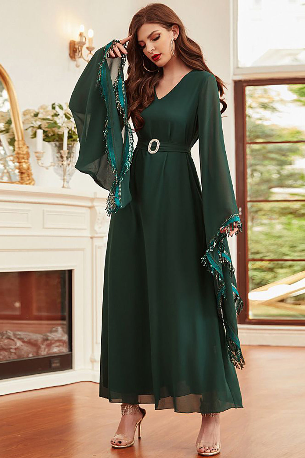 Ciemnozielona Dekolt V Abaya Sukienka Z Dlugim Rekawem