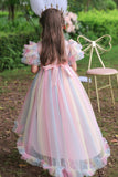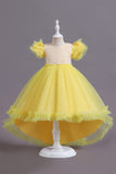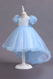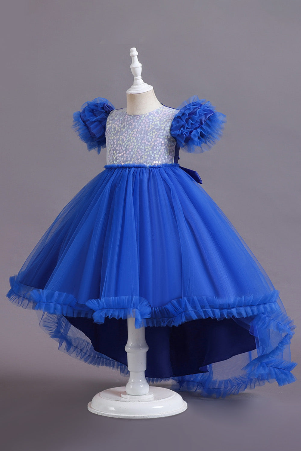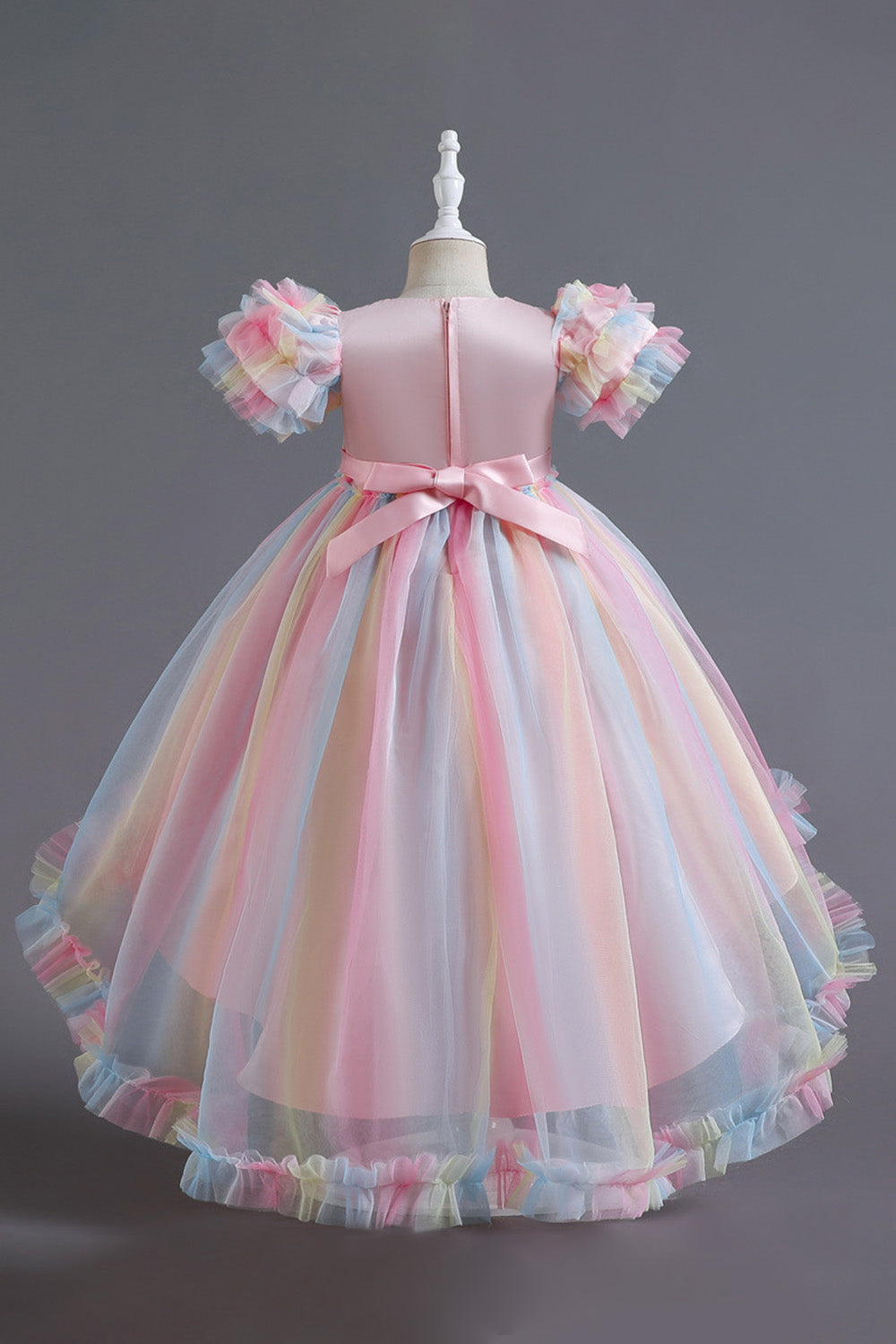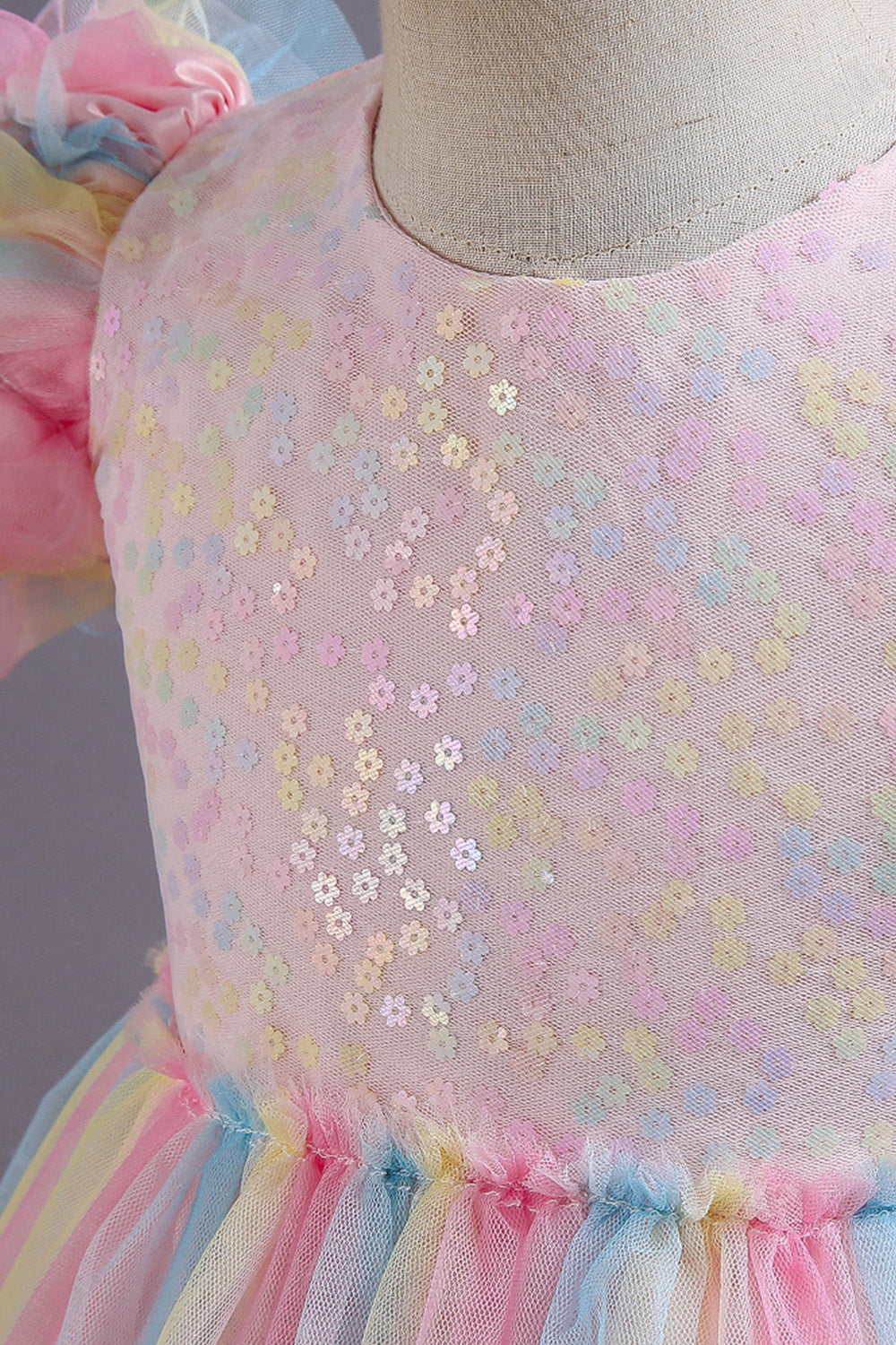 Linia Tiul Różowe Cekiny Bufiaste Rękawy Sukienka Dla Dziewczynki Na Wesele Z Kokardą