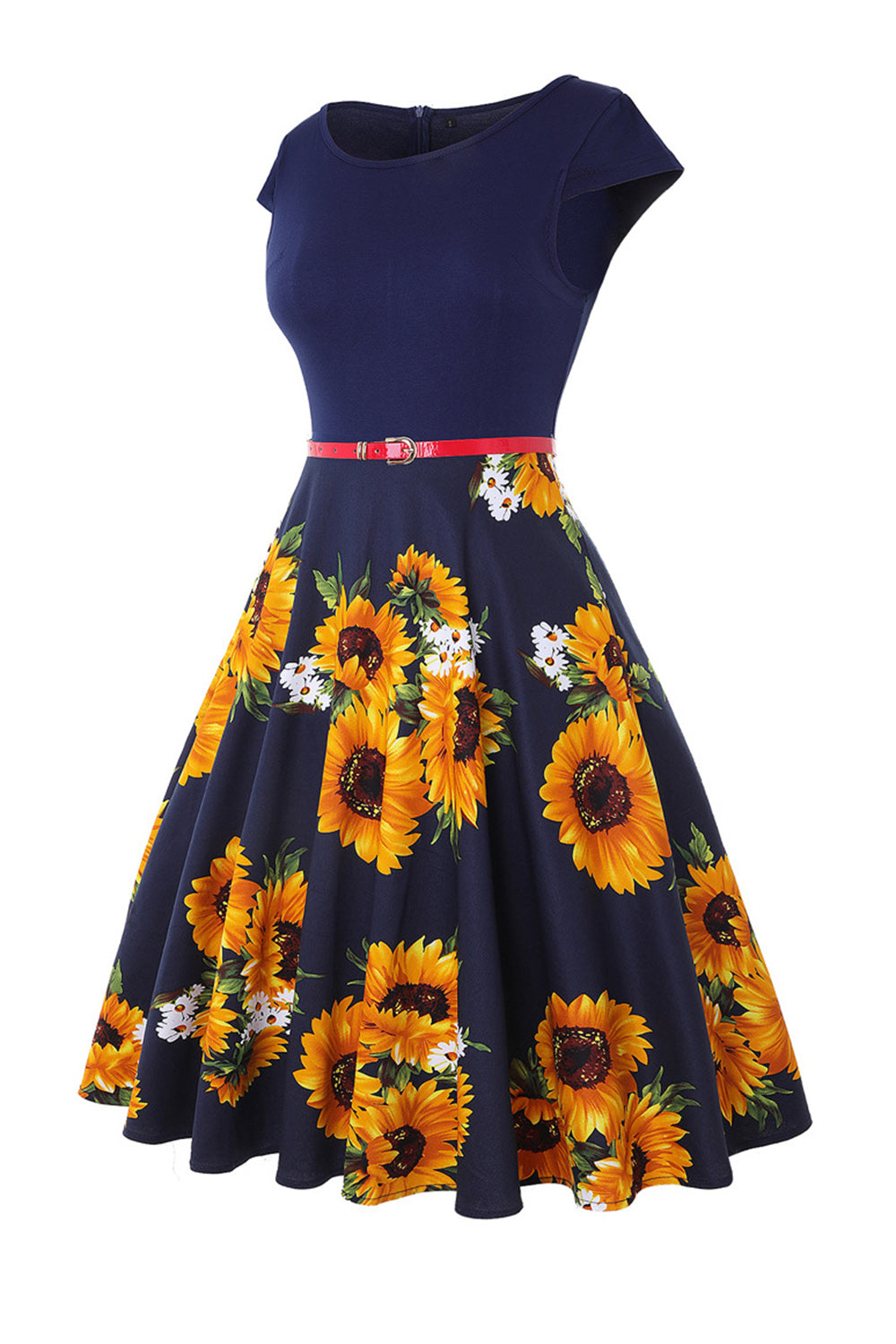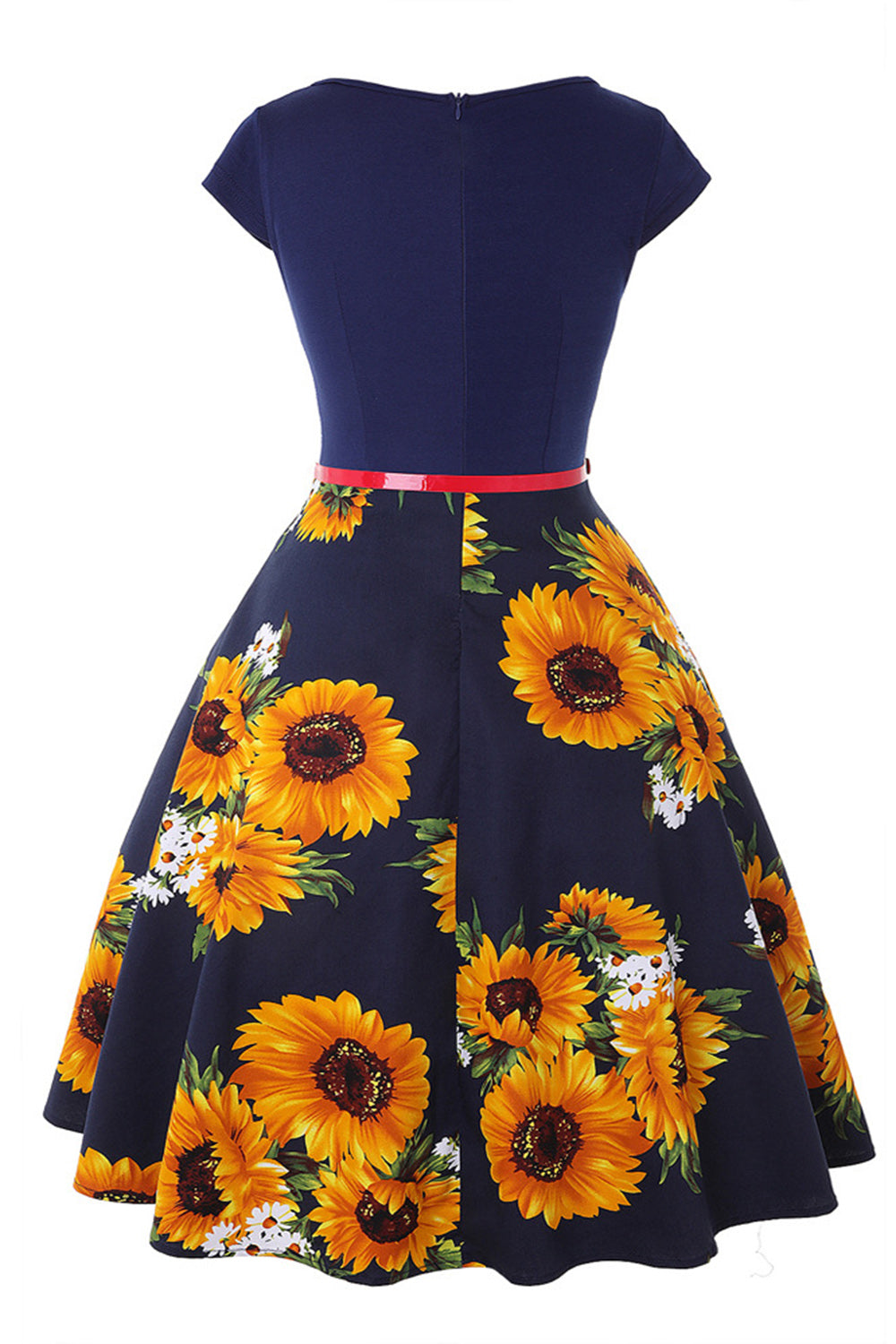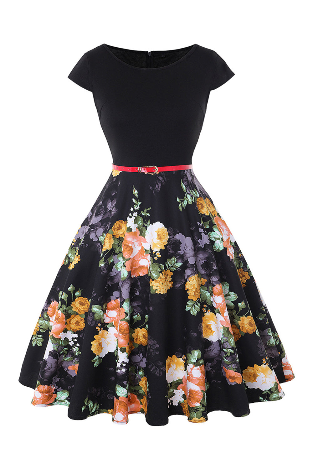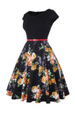 łódka DekoltKwiatowy Nadruk Czarna Sukienka Lata 50 z Paskiem