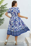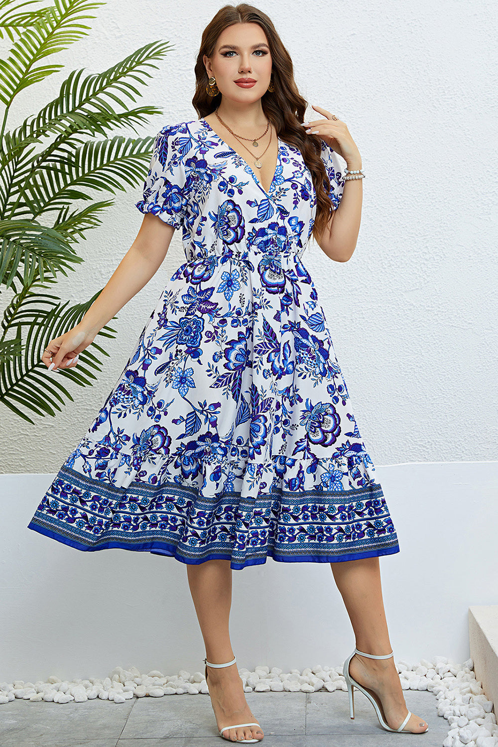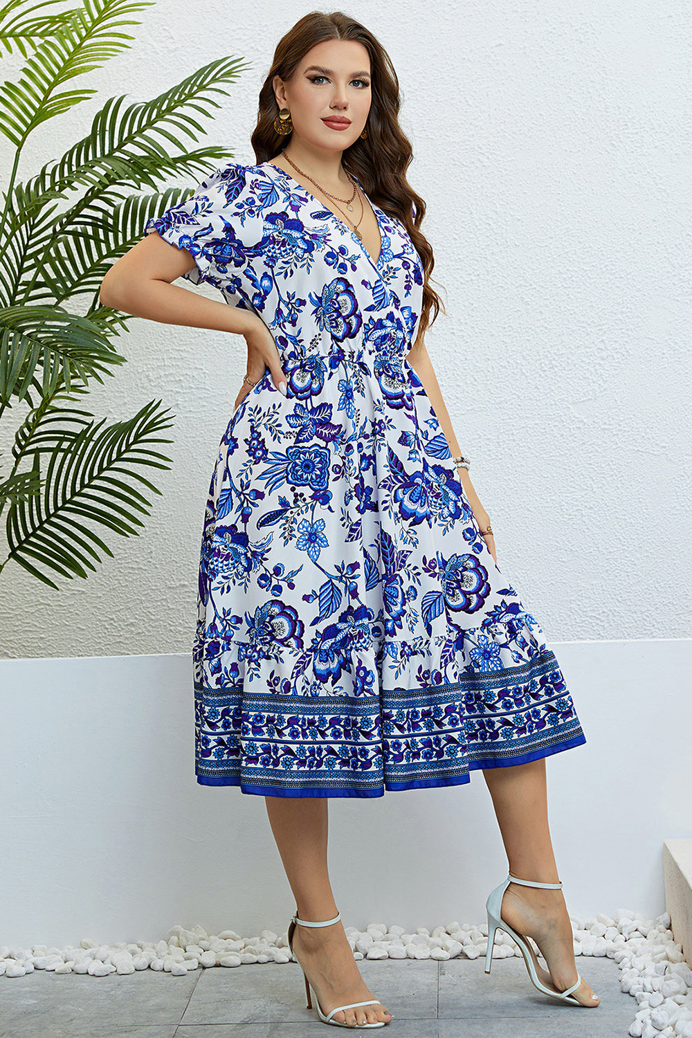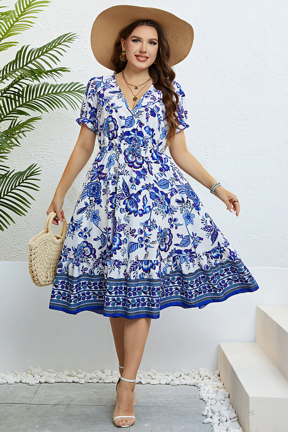 Niebieska letnia sukienka z dekoltem w serek plus size z krótkim rękawem