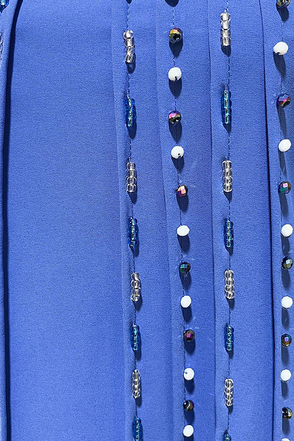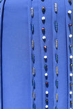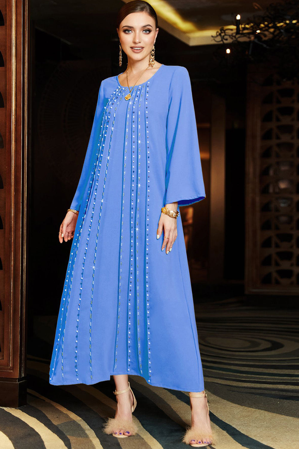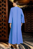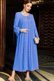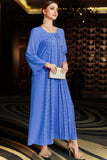 Niebieska Sukienka Kaftan z Koralikami z Dlugim Rekawem