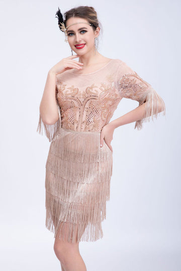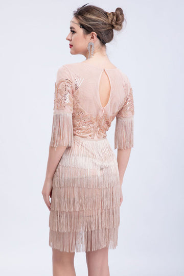 łódka Dekolt Różowa Sukienka Z Frędzlami Lata 20