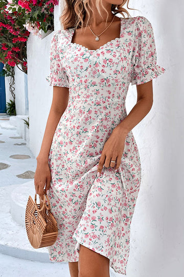 Kwiatowy Nadruk Dekolt V Różowy Sukienki Vintage z Krótki Rękaw