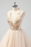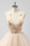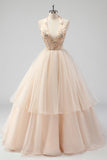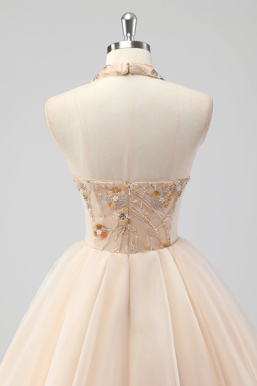 Warstwowa sukienka wizytowa z koralikami w kolorze szampana na szyi