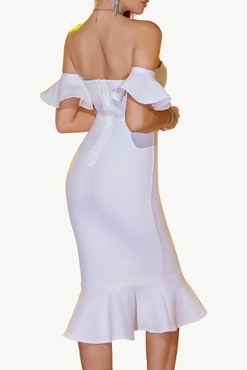 Biała Midi Sukienki Na Impreze Z Odkrytymi Ramionami Z Falbankami