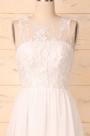 Biała sukienka z dekoltem na szyi z kwiatem 3D