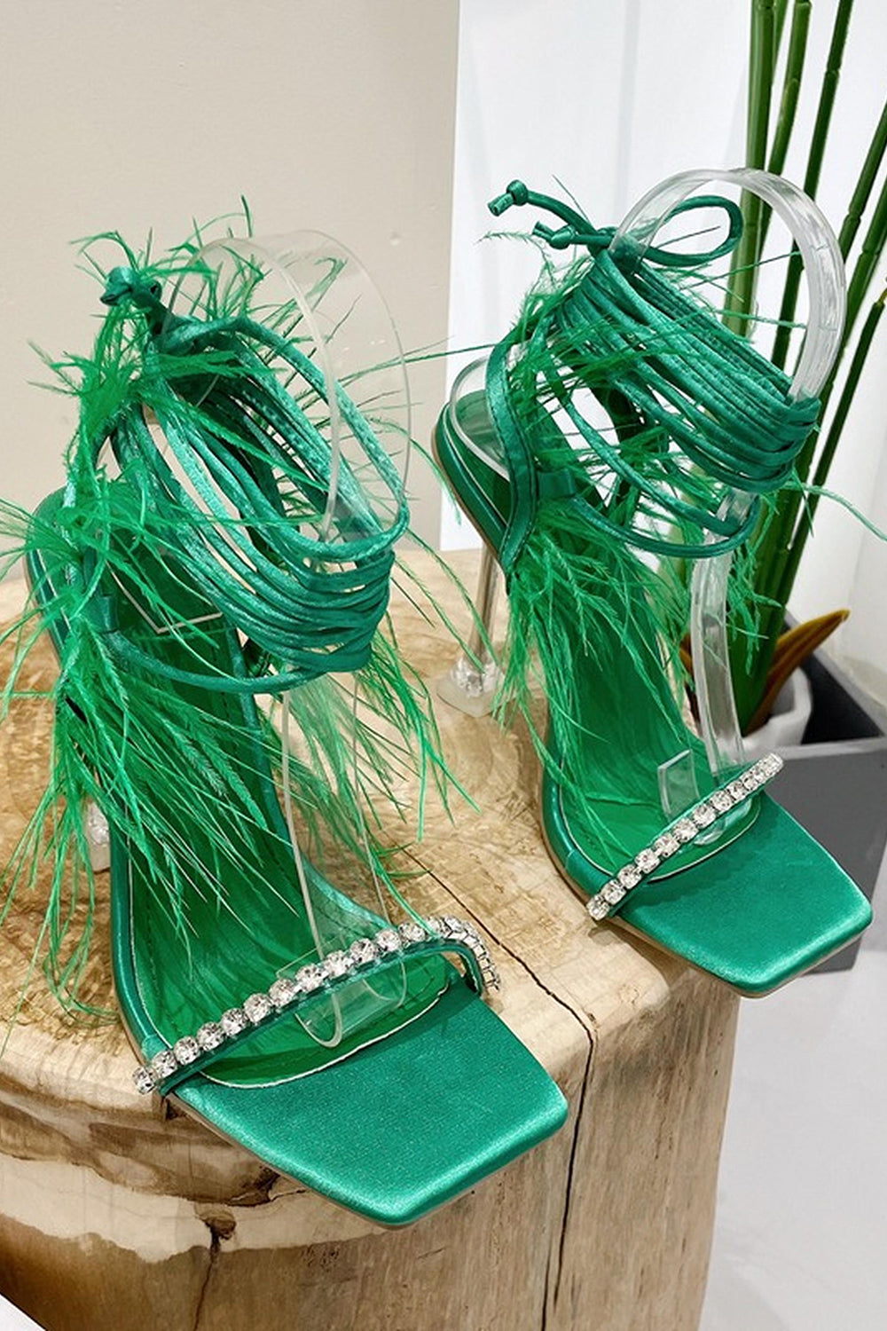Błyszczące sandały na szpilce w kolorze fuksji i piórkiem
