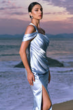 Elegancka błękitna płaszczowa plisowana satynowa długa sukienka druhny z rozcięciem