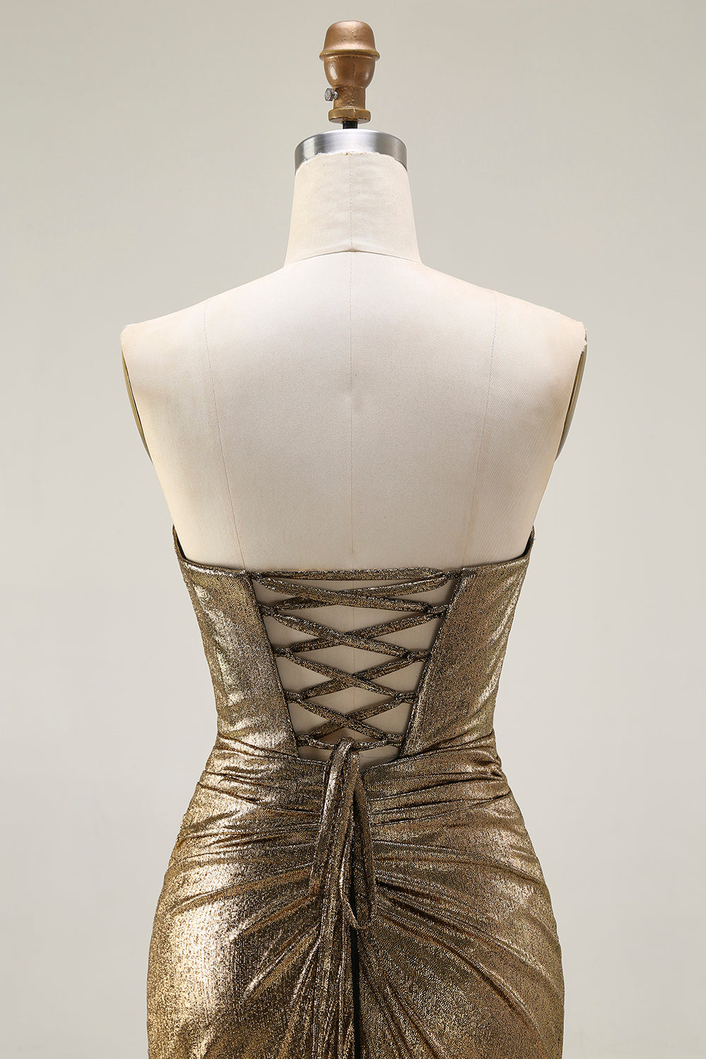 Błyszcząca Ciemny Złoty Metaliczny Długa Syrenka Sukienka Na Studniówkę z Rozcięciem