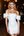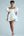 Biała sukienka mini z odkrytymi ramionami w czarne kropki