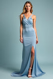 Zakurzona niebieska satynowa sukienka dla druhen z dekoltem w serek z rozcięciem
