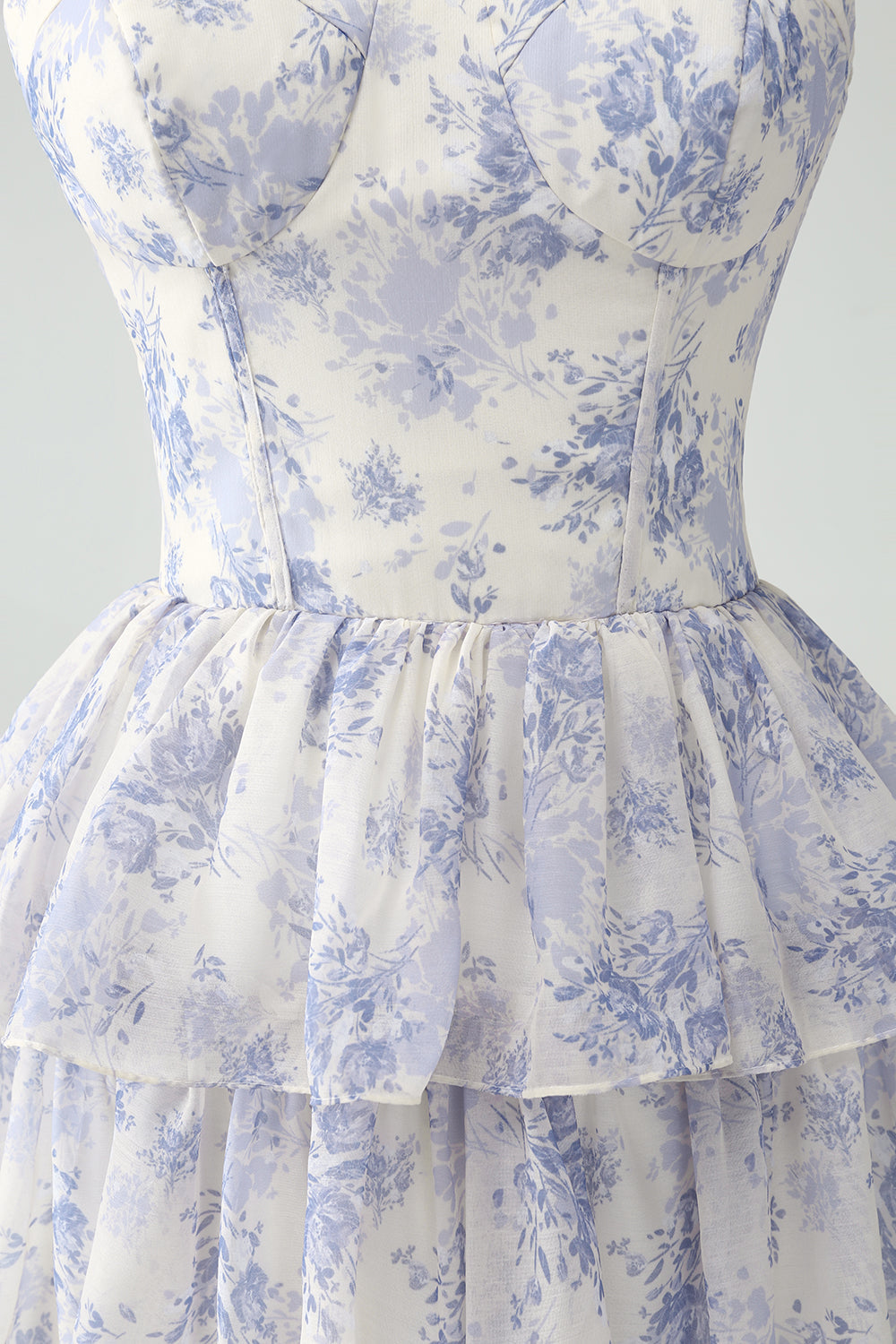 Biało-Niebieski Kwiat Szyfon Długa Sukienka Księżniczkowa z Falbankami
