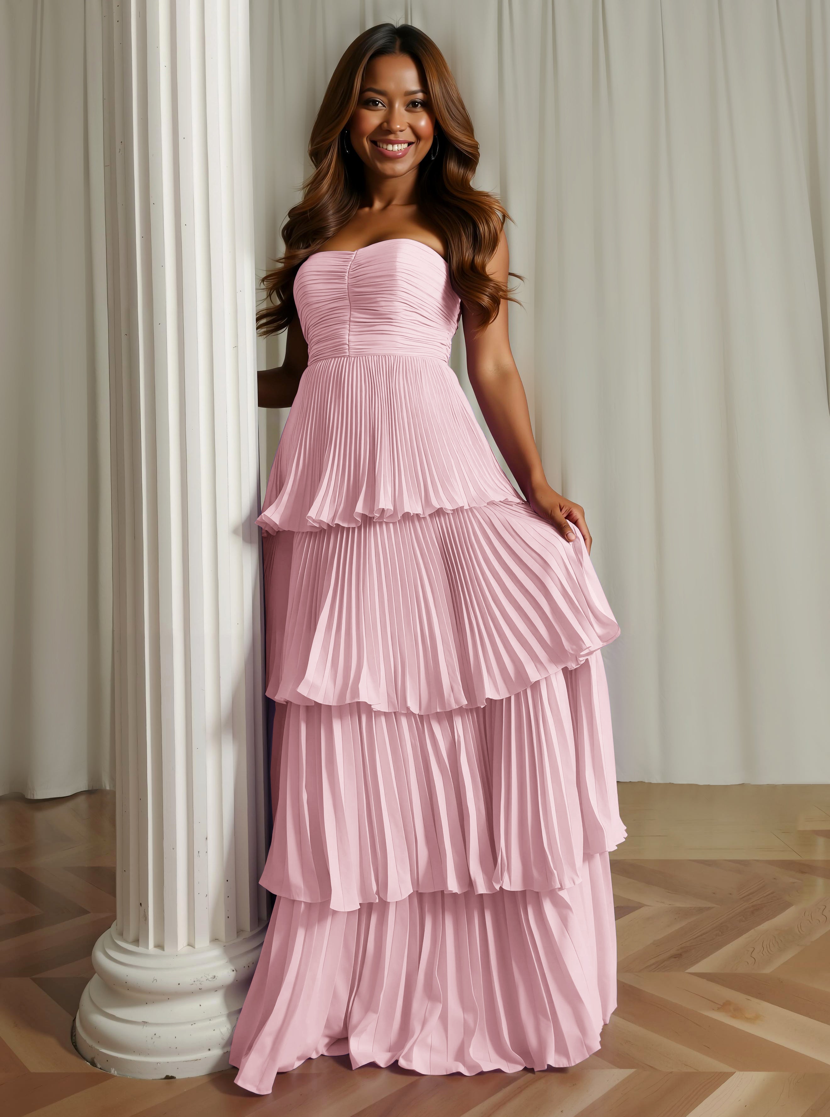 Różowa plisowana długa sukienka dla druhen bez ramiączek bez ramiączek