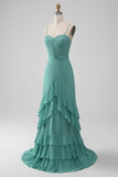 Szaro-zielone Cienkich Ramiączkach Sukienka Na Wesele z Falbankami