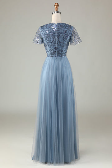 Dekolt V Zakurzony Błękit Suknia Dla Druhen Z Frezowaniem