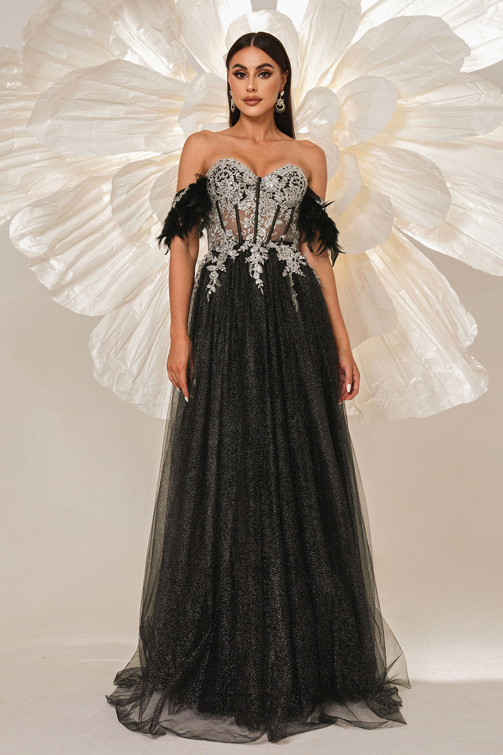 Błyszcząca Czarny Tiulowe Kształcie Litery A Piórkiem Długa Sukienka Na Wesele z Gorsetem