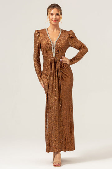 Błyszcząca Kawa Osłona Dekolt V Długie Rękawy Sukienka Na Studniówkę