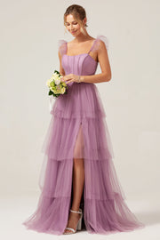 Fioletowa Gorsetowa Długa Sukienka Na Wesele z Falbanami