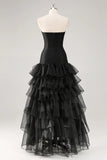 Czarny Tiulowa Bez Ramiączek Długa Sukienki Wieczorowe z Falbankami