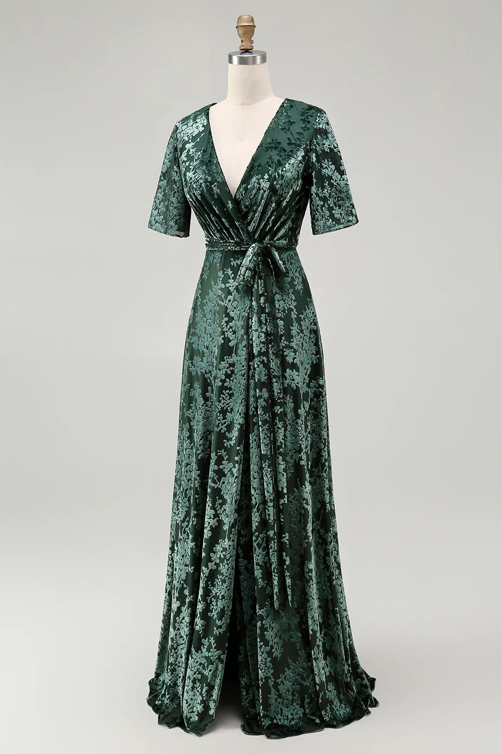 Ciemnozielony Aksamit Dekolt V Długa Sukienki Na Wesele z Rękawy