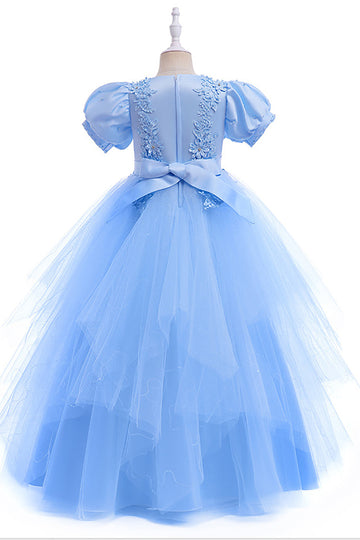 Tiulowe bufiaste rękawy Jasnoniebieska sukienka Flower Girl z aplikacjami