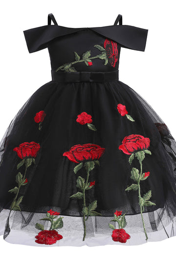 Zimne Ramię Czarna Sukienki Dla Dziewczynek z Haftem