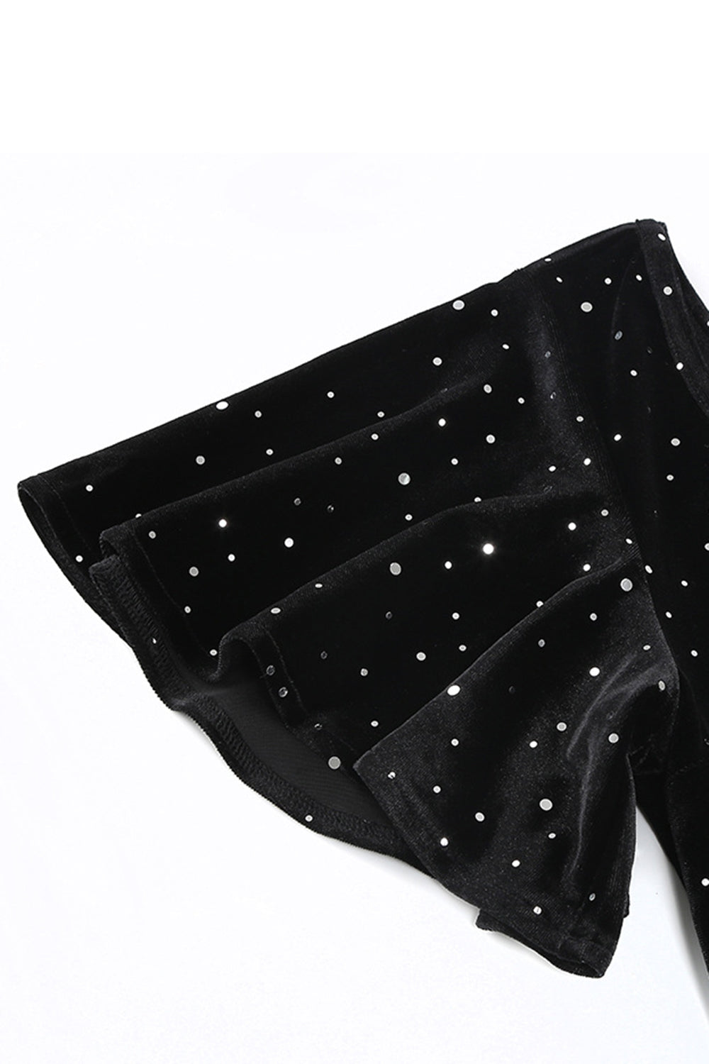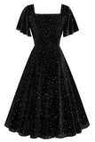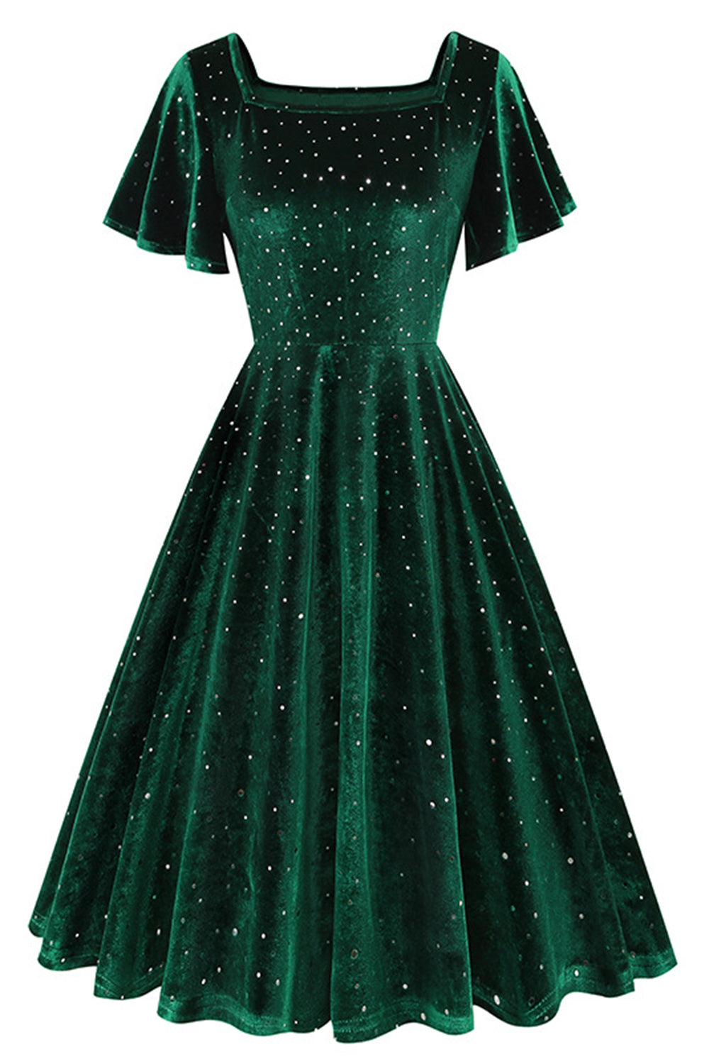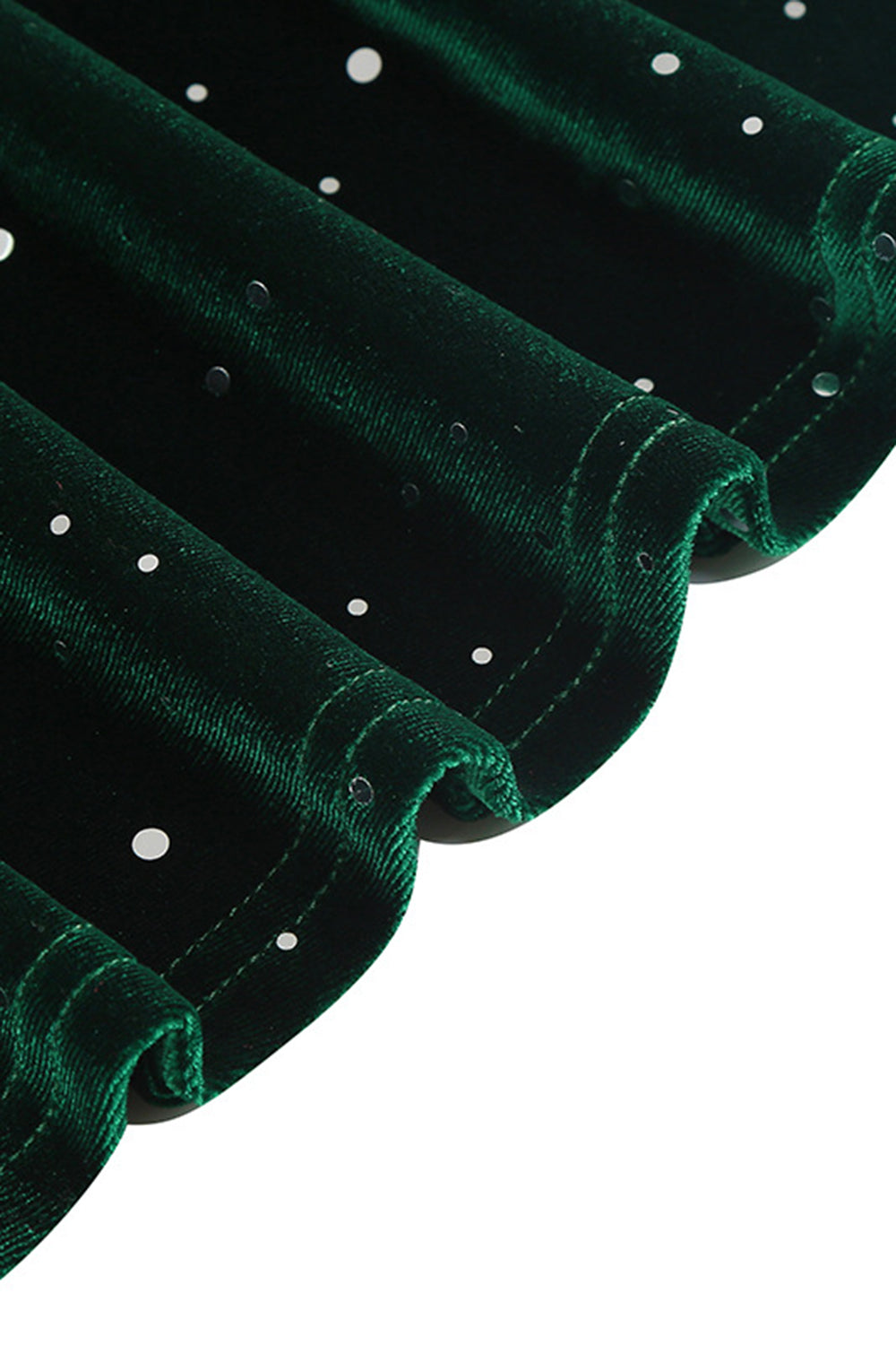 Ciemnozielona Aksamitna Sukienka Midi W Kropki Z Kwadratowym Dekoltem I Rękawami W Stylu Vintage
