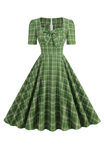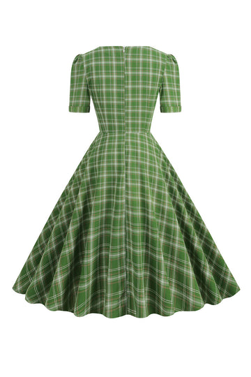 Jewel Neck Green Grid 1950s Sukienka z krótkim rękawem