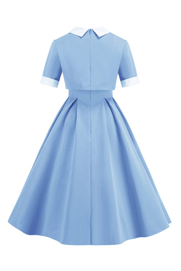 Niebieski kołnierzyk Piotruś Pan Dwuczęściowa sukienka midi vintage 1950 z guzikami