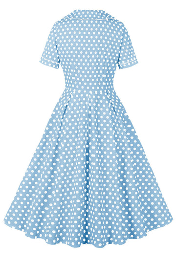 Niebieski Dekolt Z Klapami W Kropki Vintage Sukienka Z Krótkimi Rękawami