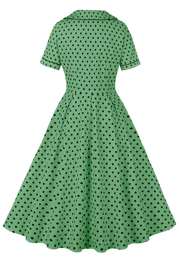 Zielony Dekolt Klapy W Kropki Vintage Sukienka Z Krótkim Rękawem