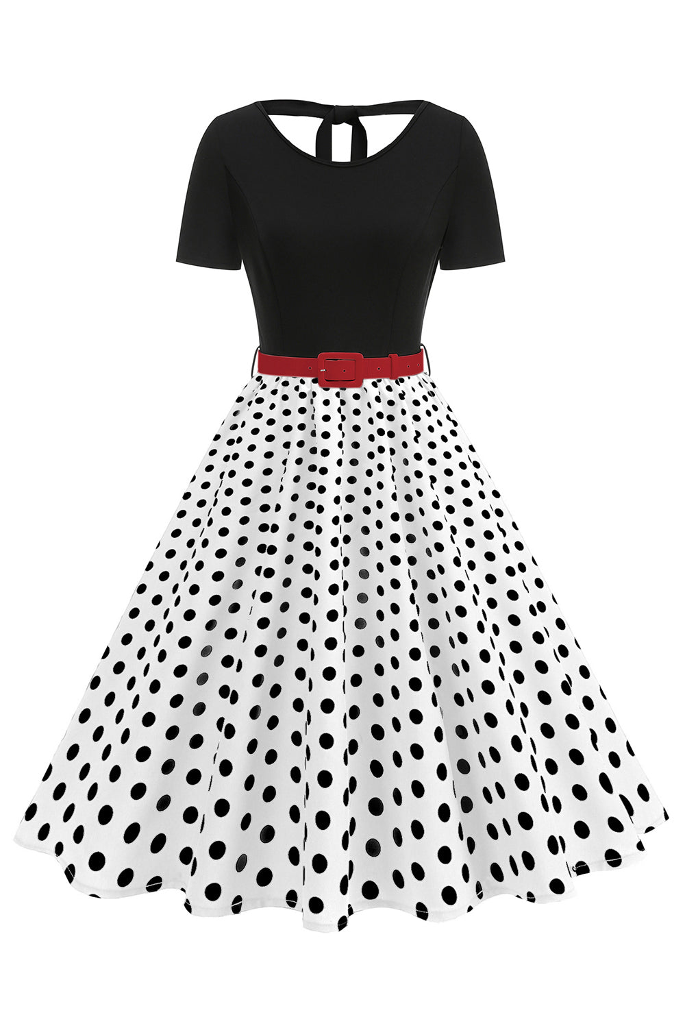 Sukienka z lat 50. z okrągłym dekoltem i czarnymi groszkami w krople