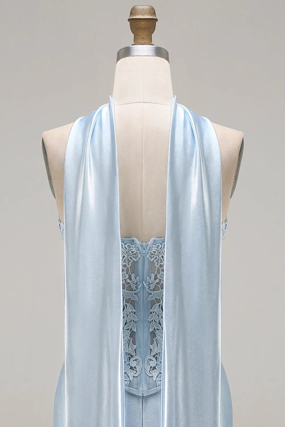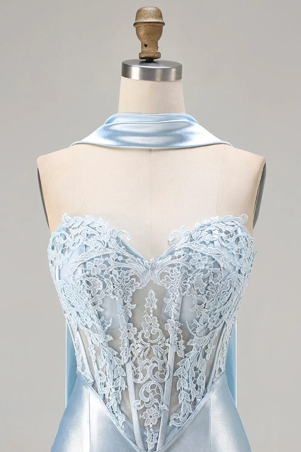Niebieski Satynowa Syrenka Długa Dekolt W Kształcie Serca Sukienka Na Studniówkę z Koronki