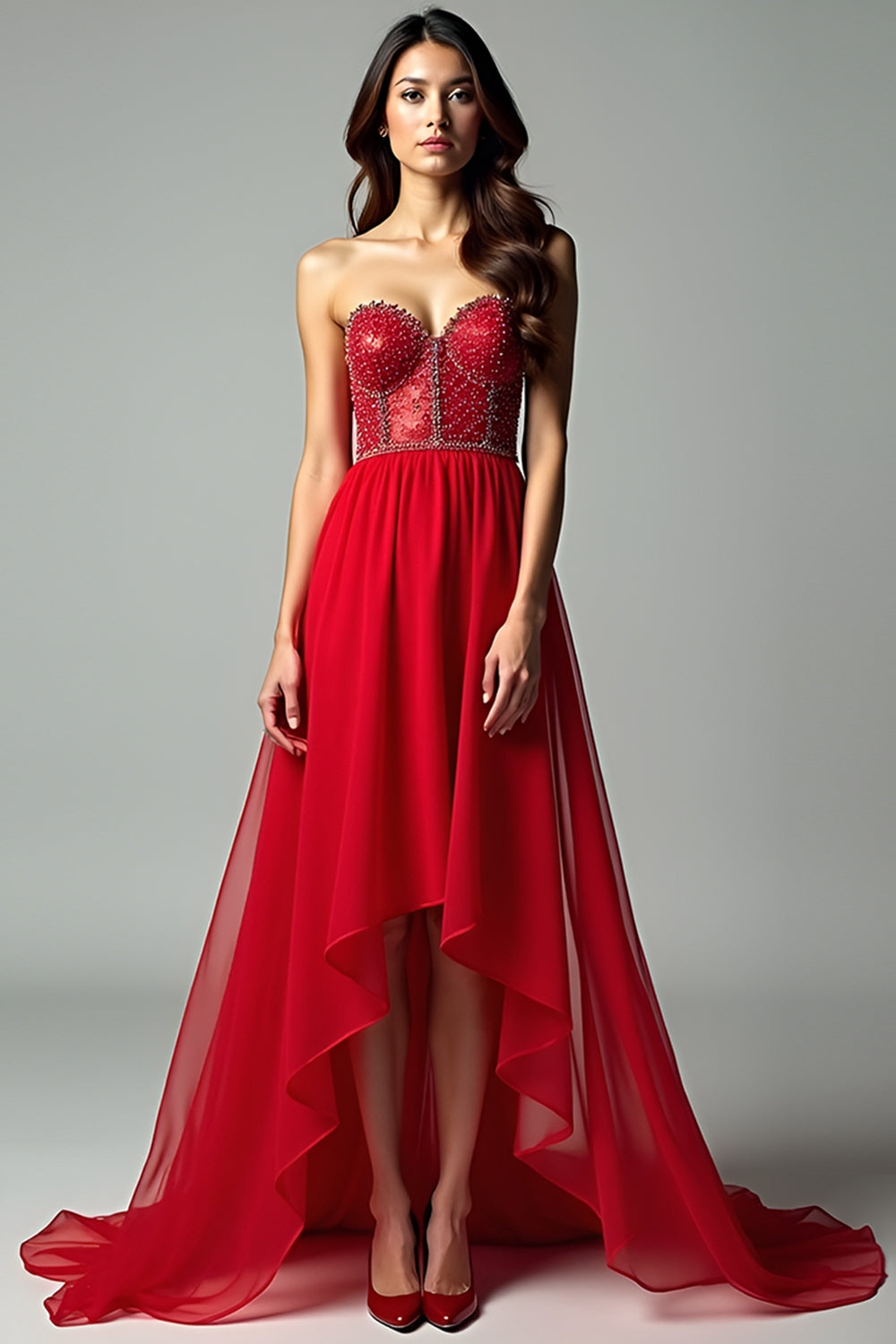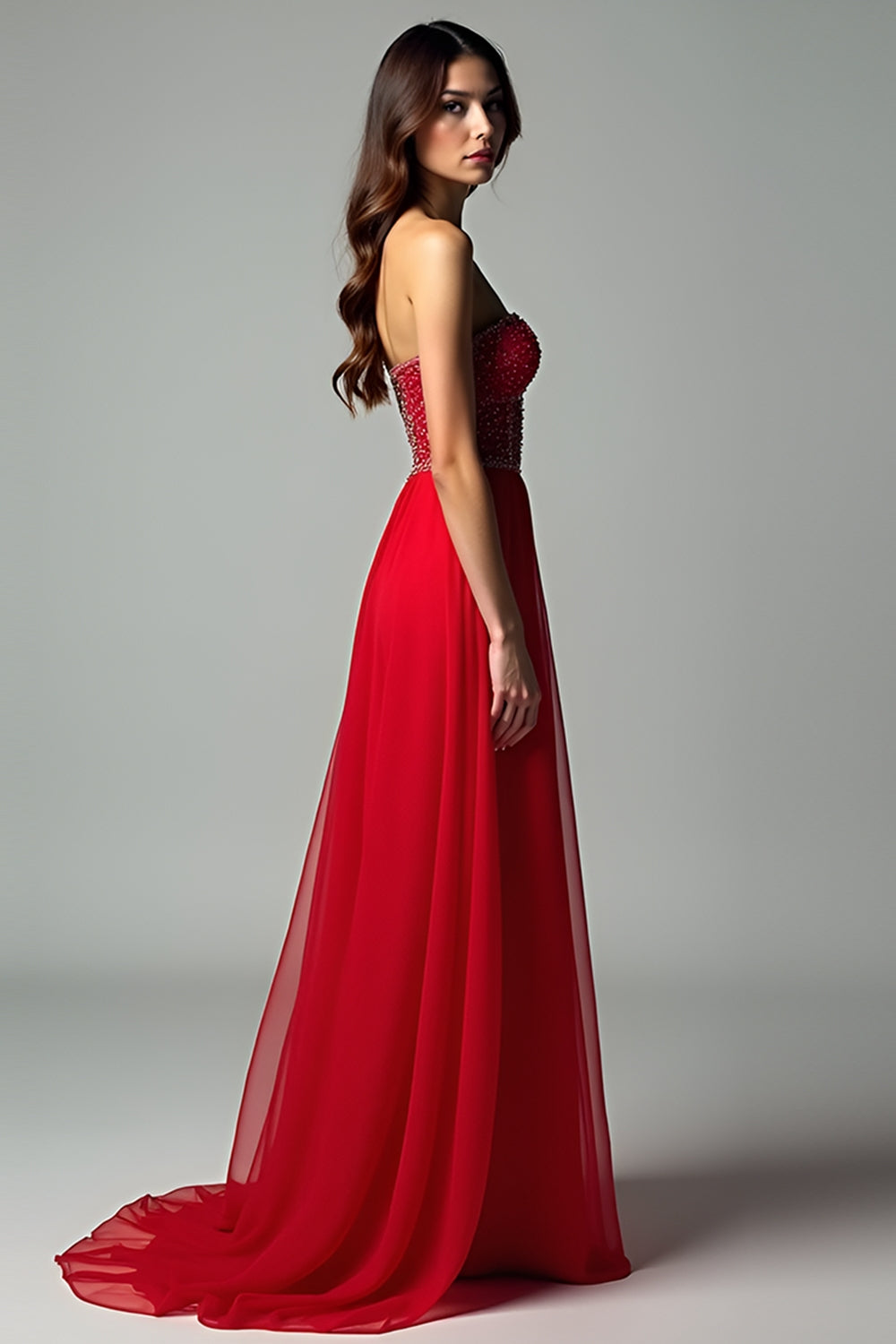 Linia czerwony gorset bez ramiączek z koralikami długa sukienka dla gości weselnych