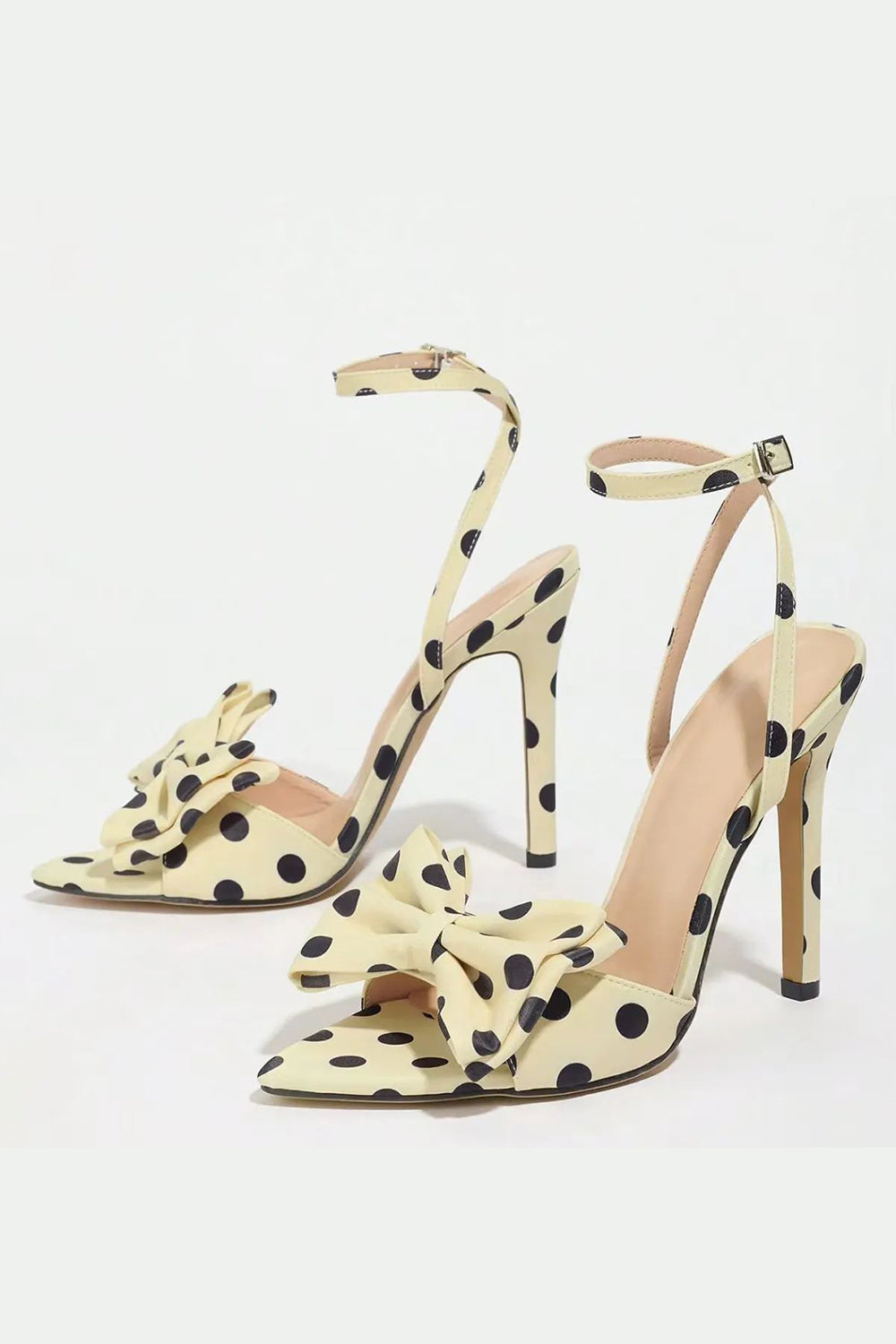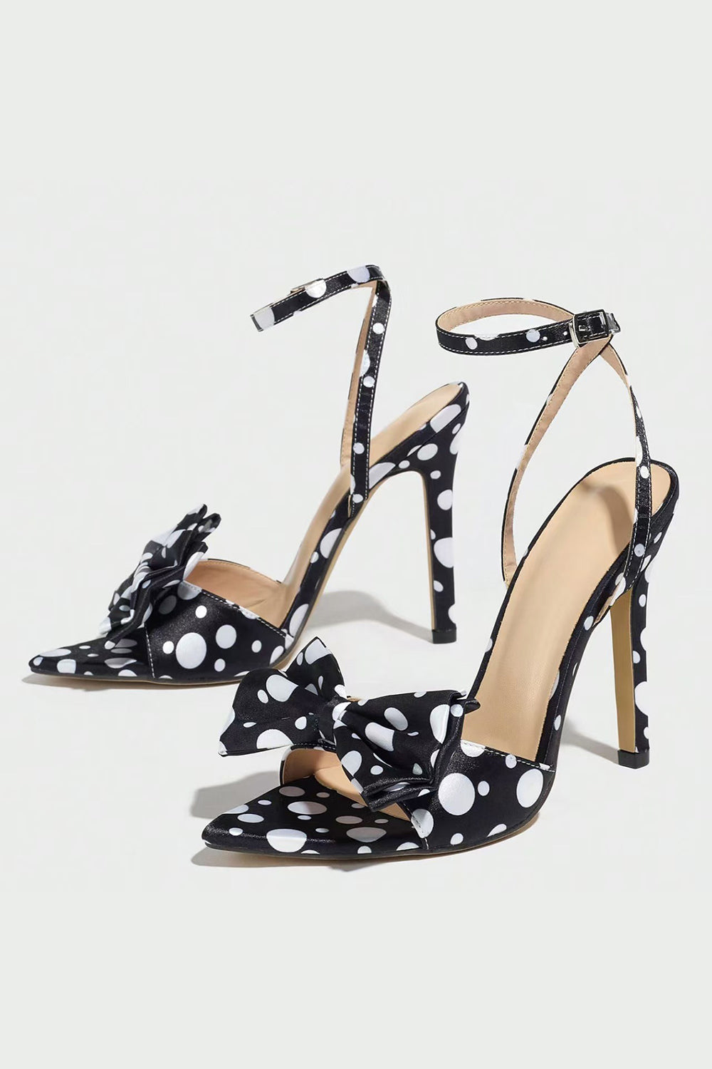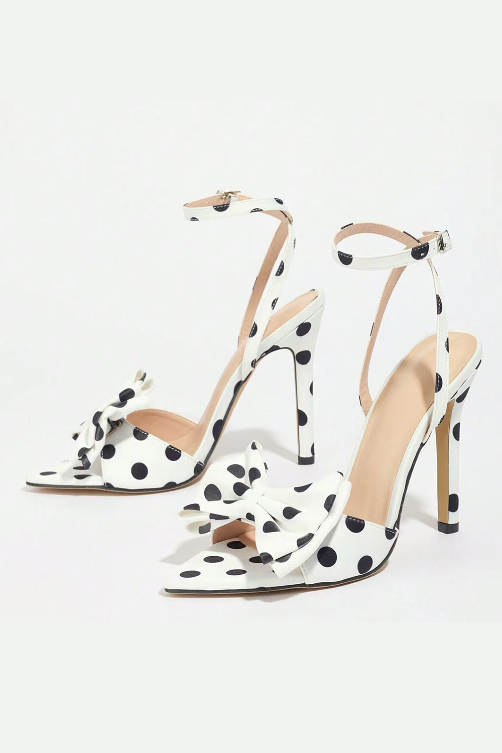 Białe czarne kropki w kropki, szpilki z odkrytymi palcami, wysokie obcasy z kokardą