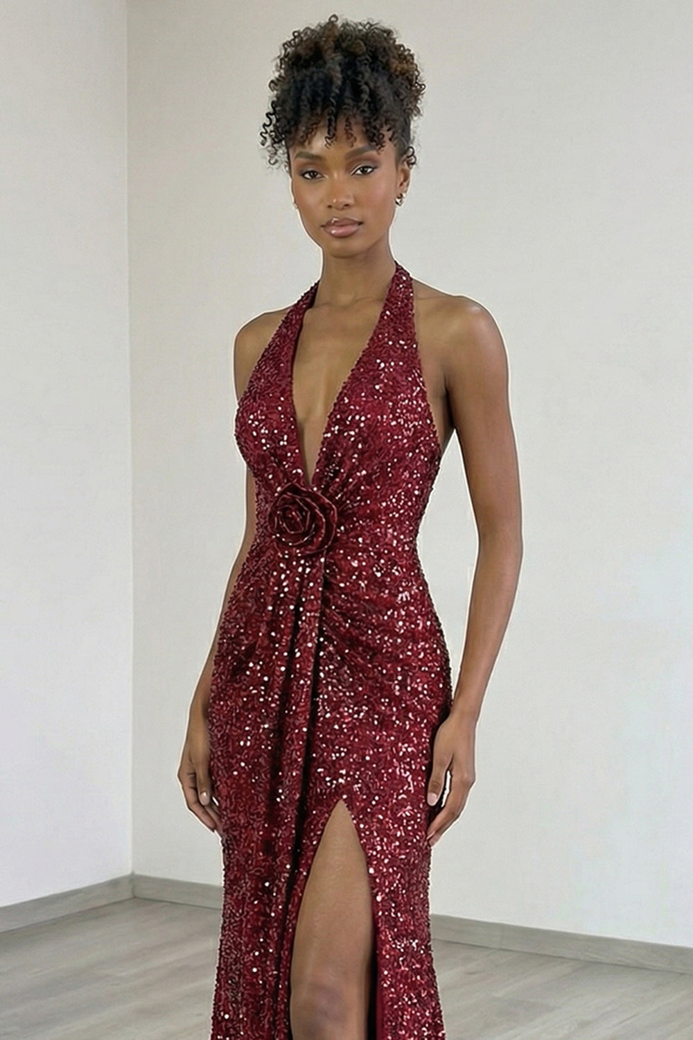 Błyszcząca bordowa sukienka na bal z cekinami i rozcięciem