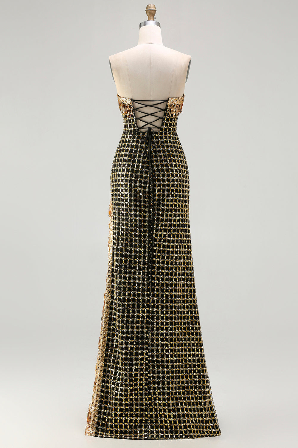 Błyszcząca, złota cekina bez ramiączek – długa sukienka balowa z rozcięciem