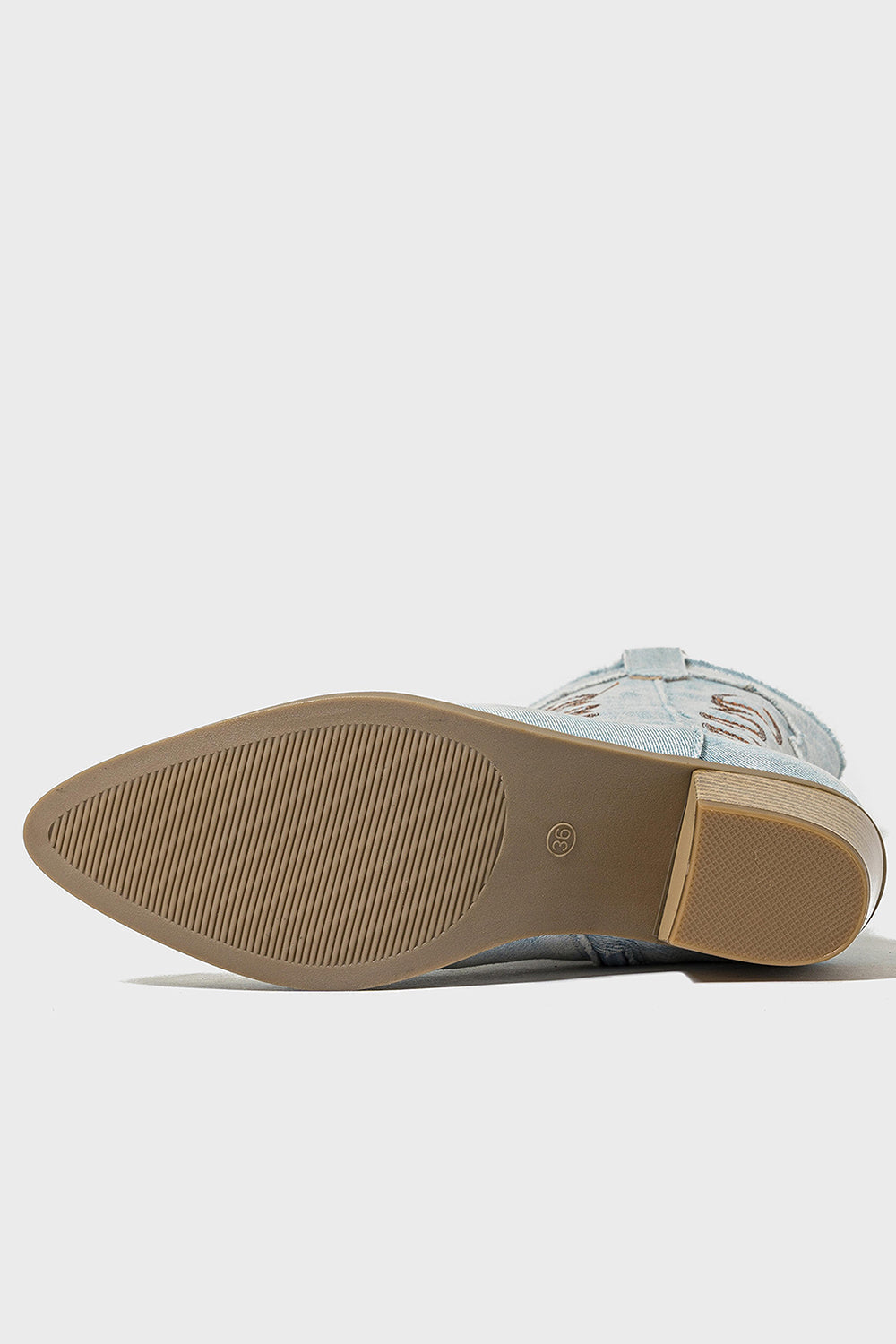 Ciemnoniebieskie szpiczaste noski na środku łydki na grubym obcasie haftowane kowbojki