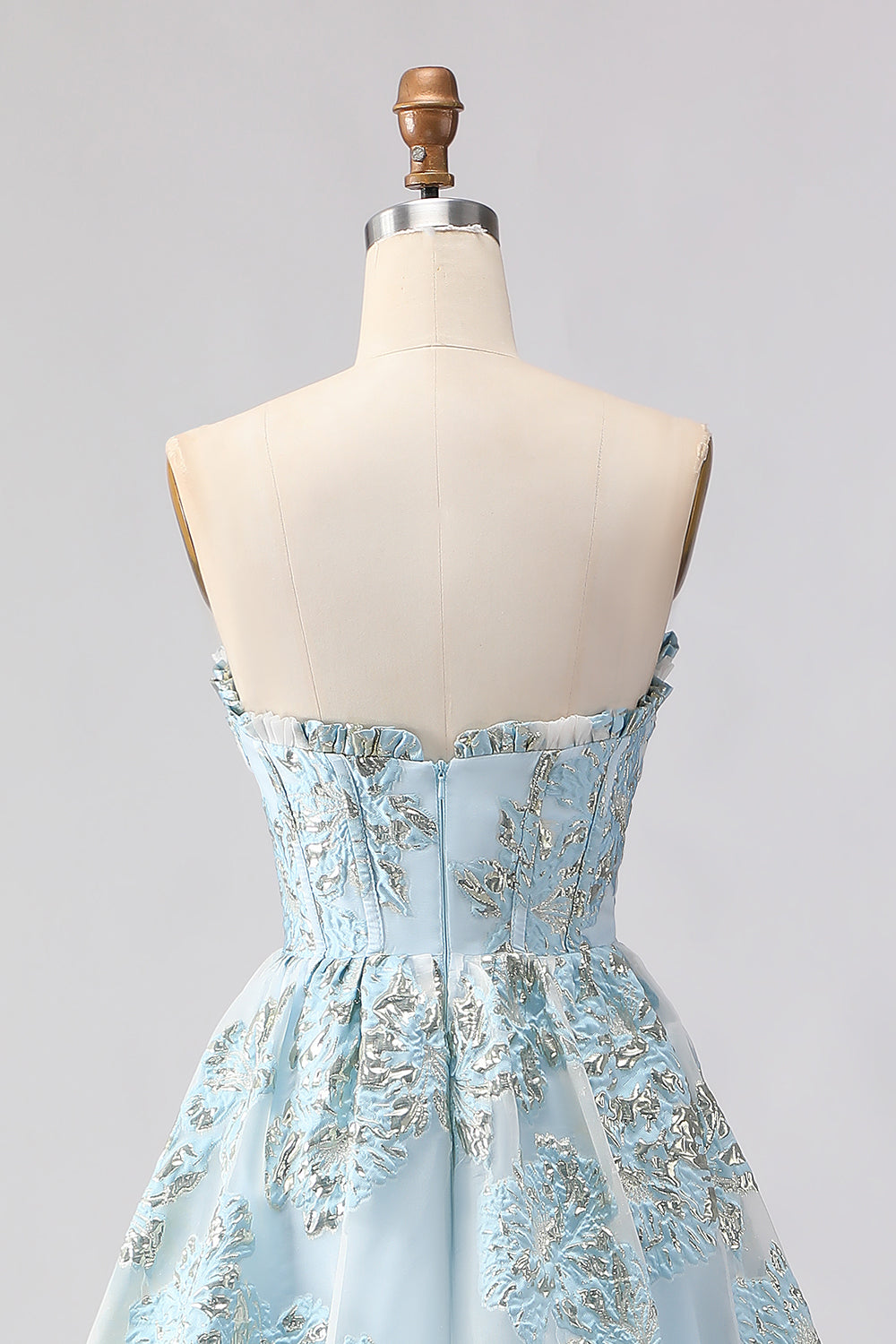 Długa sukienka balowa bez ramiączek w linii A A z długim żakardem i rozcięciem