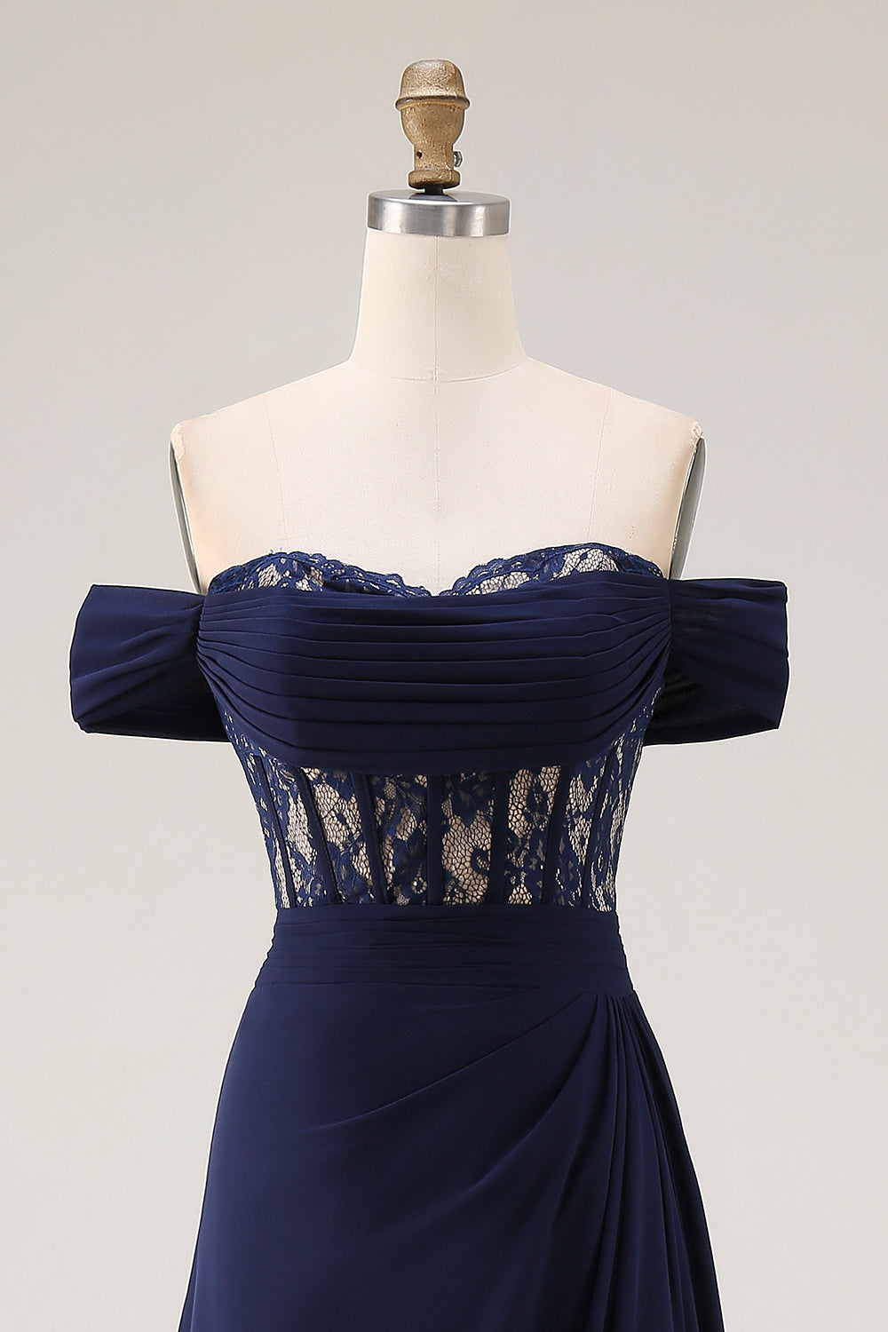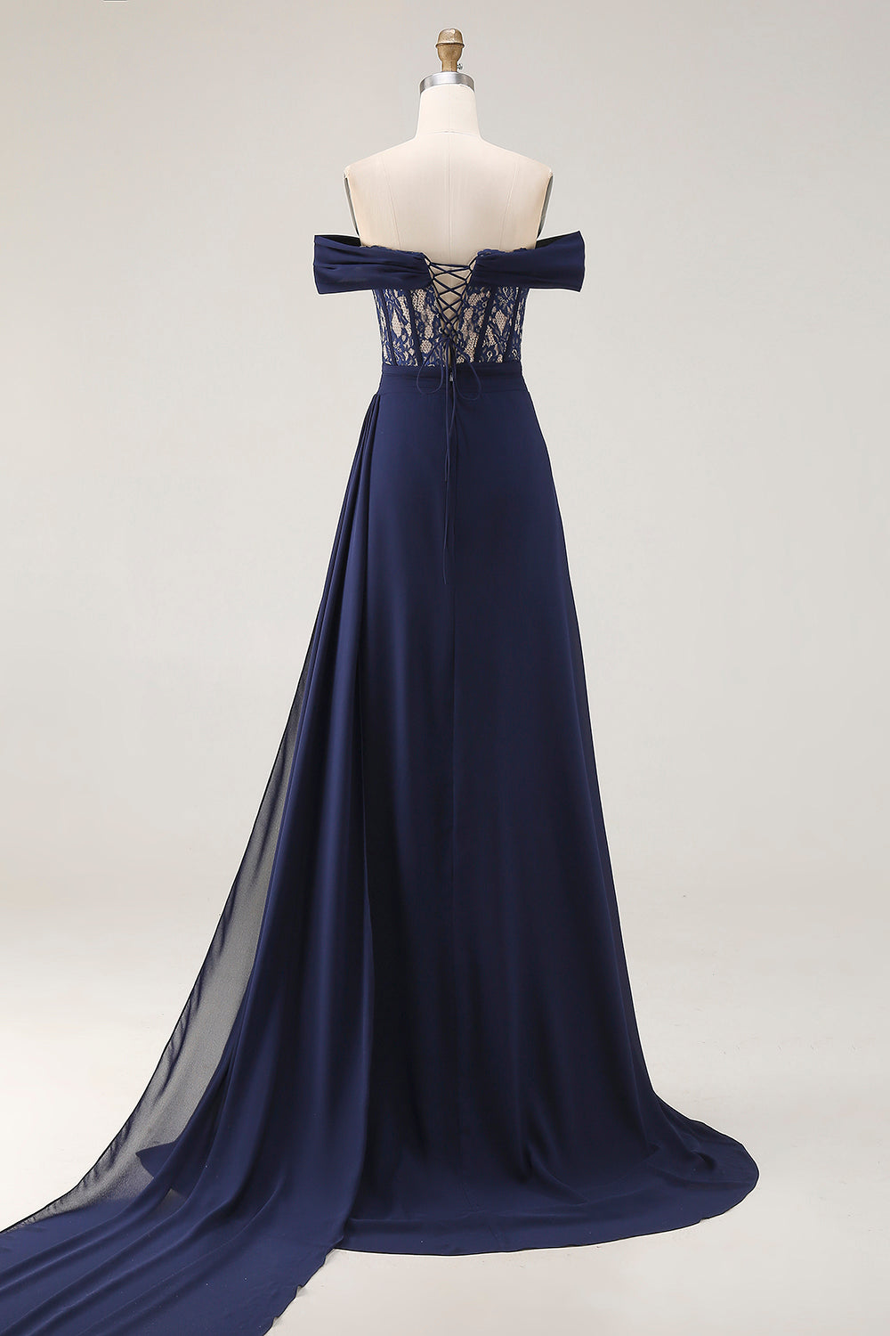 Granatowa gorset w stylu A z odkrytymi ramionami – długa sukienka na bal maturalny z sznurowaną na plecach