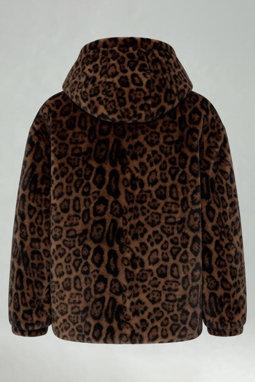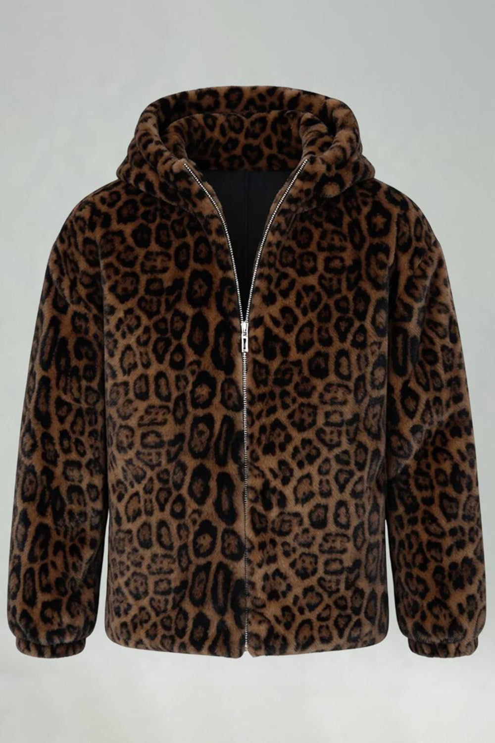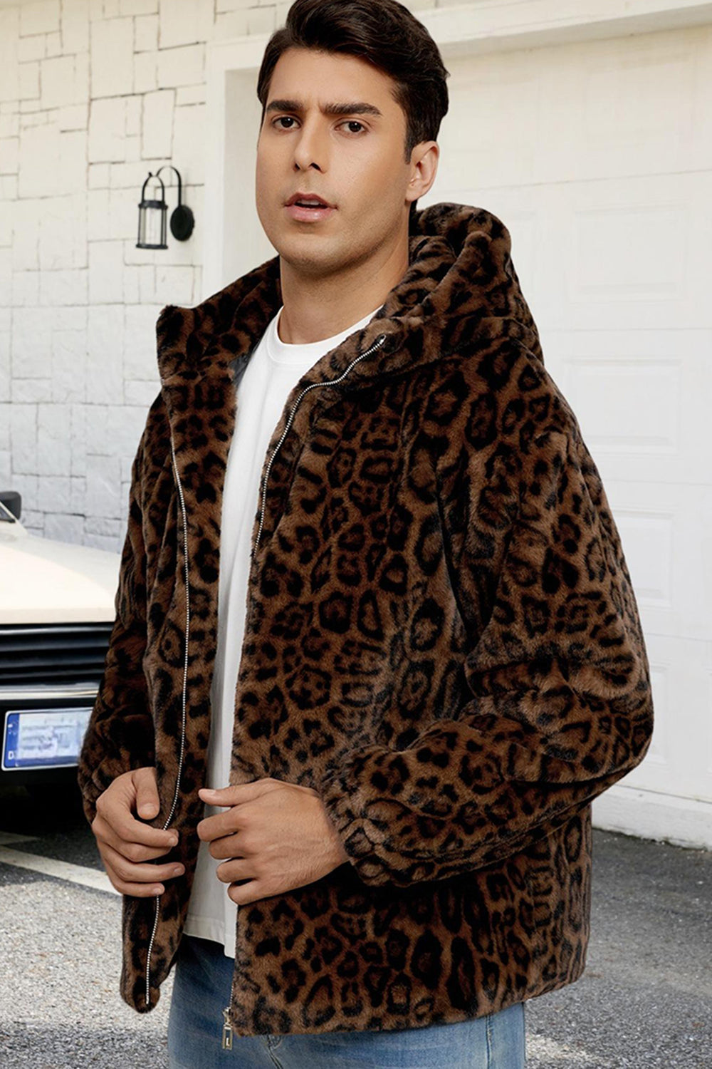 Męski zimowy płaszcz z brązowym futrem lamparta z futram z kapturem dla mężczyzn