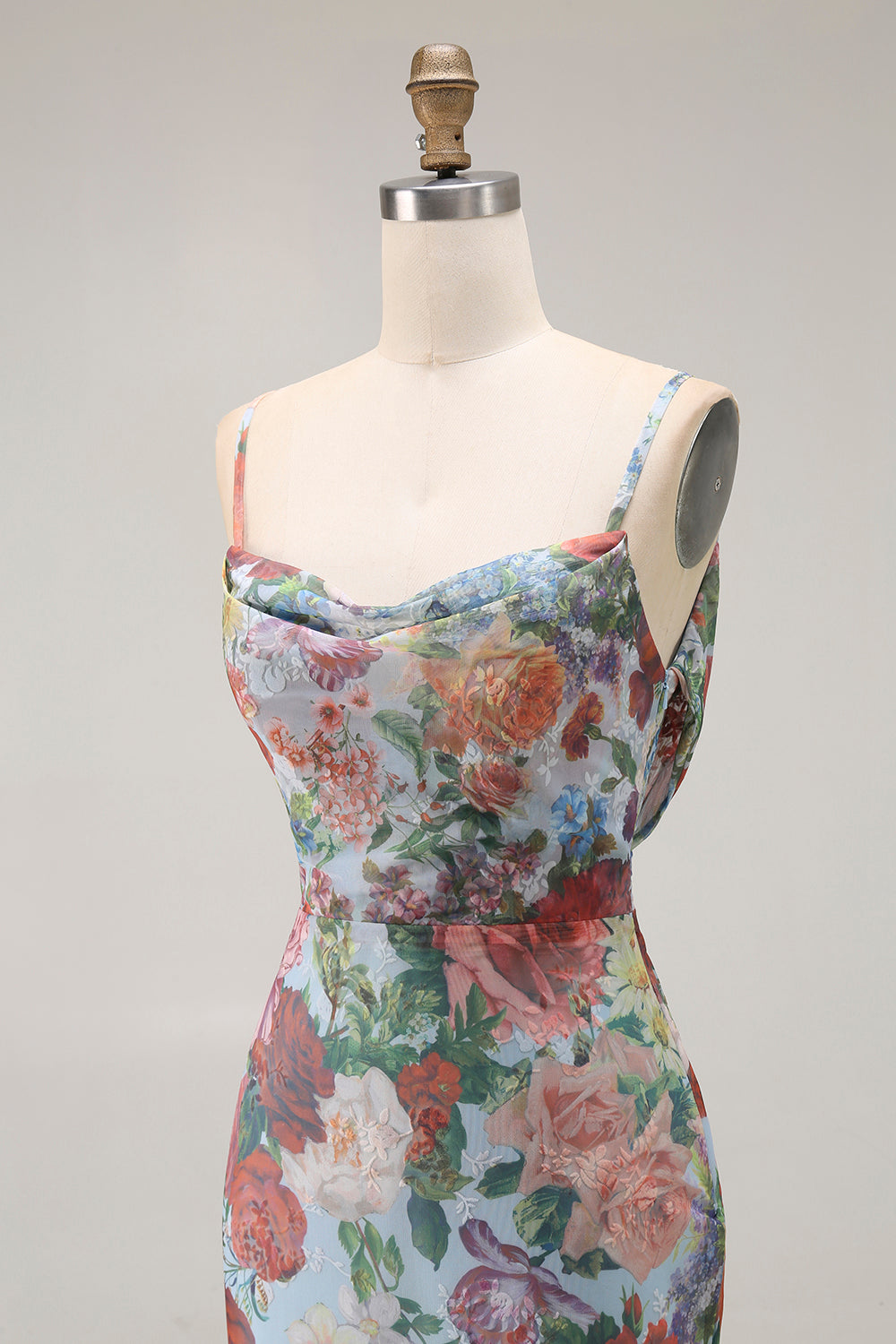 Niebieska sukienka dla druhen z nadrukiem na cienkich ramiączkach z rozcięciem
