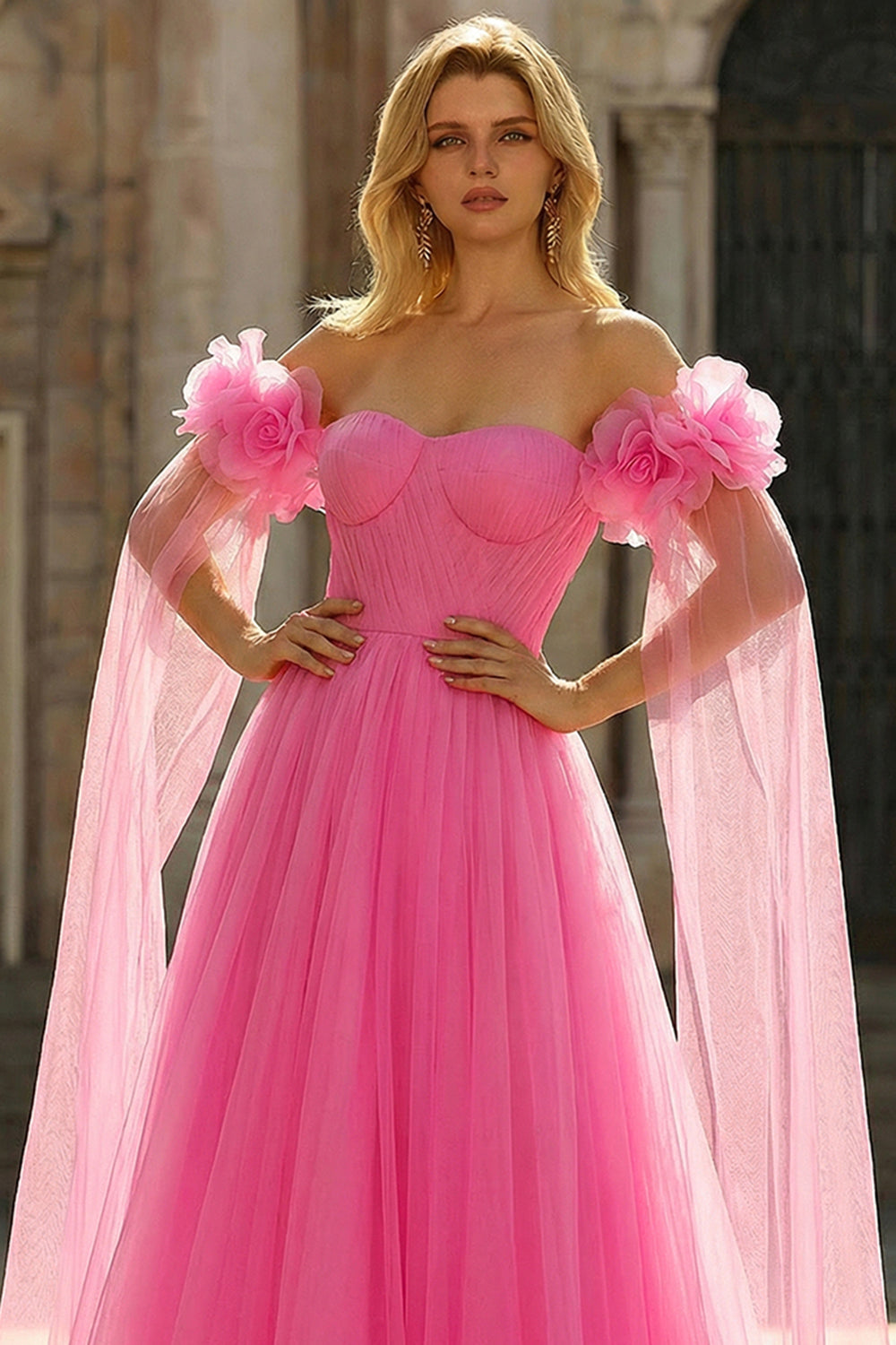 Gorący Róż Tiulowe Odkrytymi Ramionami Długa Sukienka Na Studniówkę z Falbankami