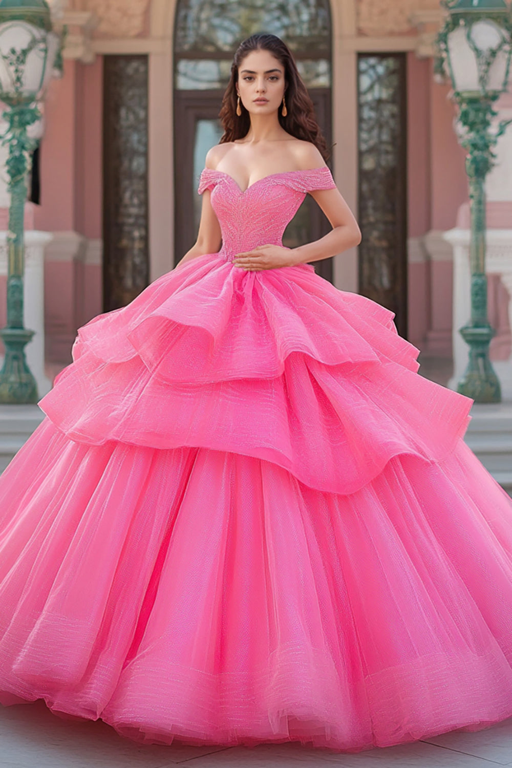 Suknia balowa z aplikacjami w kolorze fuksji z odkrytymi ramionami Quinceanera