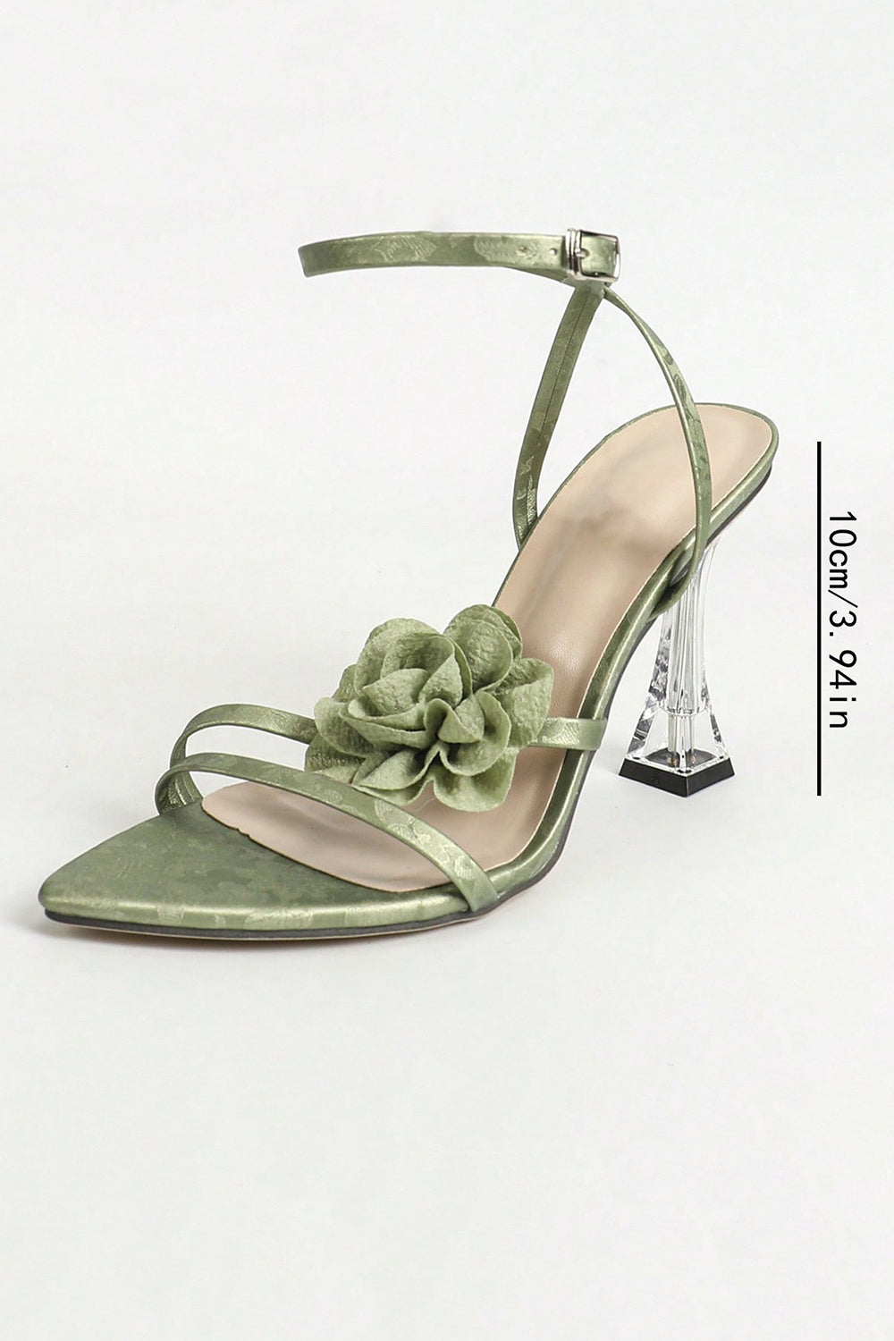 Zielone paska na kostkę z otwartymi palcami, przezroczyste szpilki z kwiatami 3D